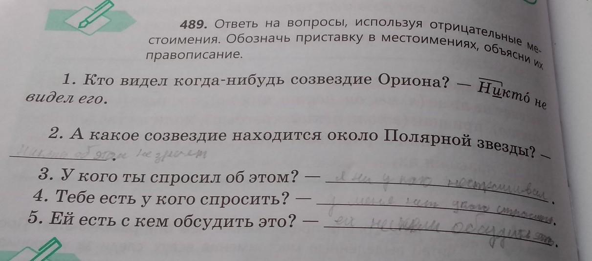 489. Ответы на вопросы, используя отрицательные ме- стоимения. Обозначь приставку в местоимениях, объясни правописание. 1. Кто видел когда-нибудь созвездие Ориона? - Hukmo видел его. Не Полярной звезды? 2. А какое созвездие находится около see zporem 3. У кого ты спросил об этом? 1, 2 и 60 4. Тебе есть у кого спросить? 5. Ей есть с кем обсудить это? -там написано но я не уверен что правильно