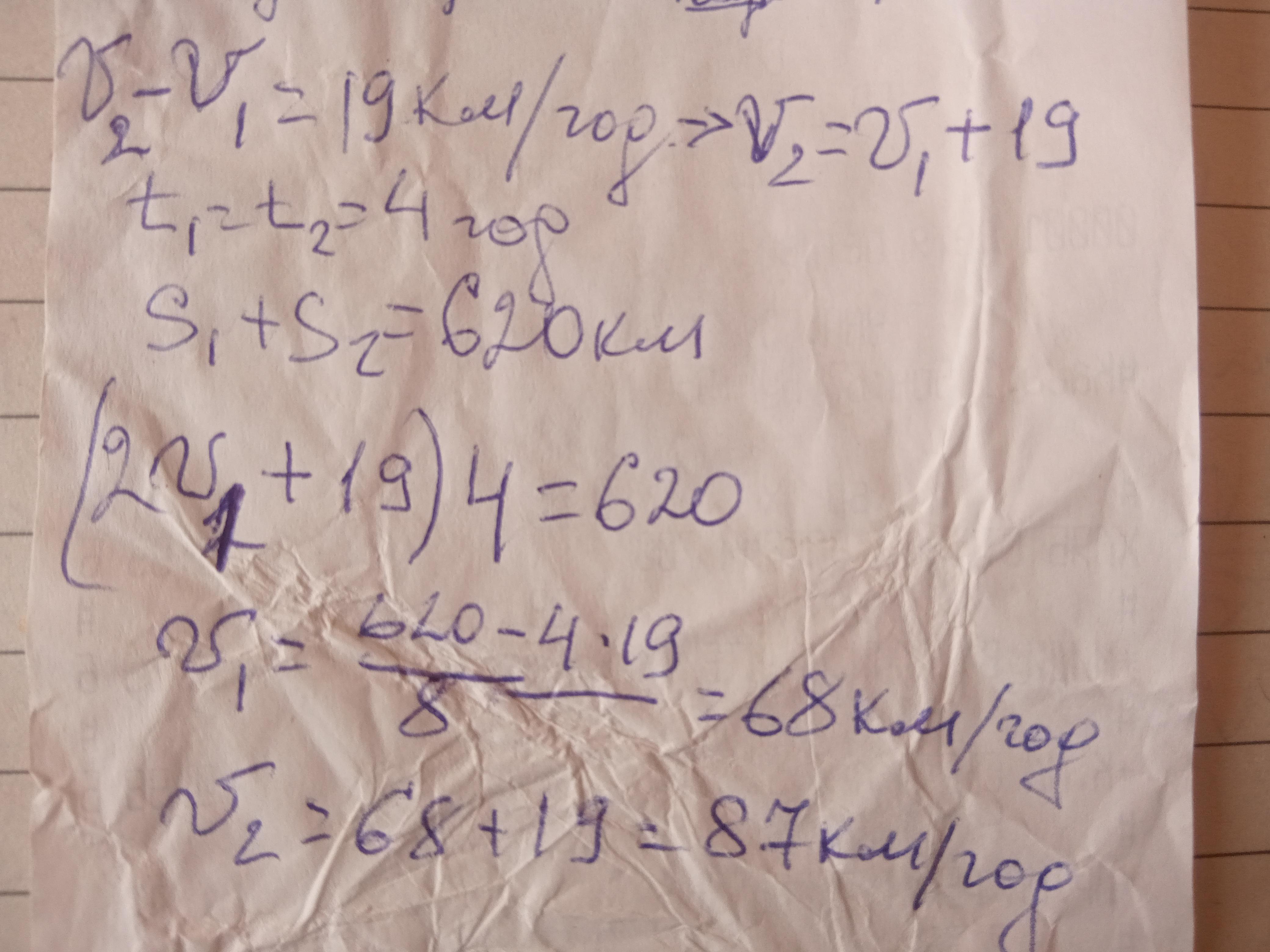 Автобус і вантажна машина, швидкість якої на 19 км/год більша від швидкості автобуса, виїхали одночасно назустріч одне одному із двох міст, відстань між якими складає 620 км. Визнач швидкості автобуса й вантажної машини, якщо відомо, що вони зустрілися через 4 год після виїзду.