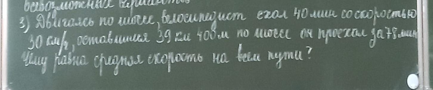 3) двигалась по шассе, велосипедист ехал 40 мин со скоростью 30 км/ч, остановишся 39 км 400 м по шассе он проехал за 78 мин чему равна средняя скорость на всем пути? помогите пожалуйста добрые людии