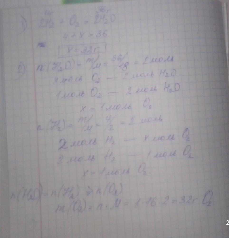 За рiвнянням реакцiї 2Н2 + 0 = 2Н. 0 розрахуйте, яка маса кисню прореагувала з воднем масою 4 г, якщо утворилась вода масою 36 г