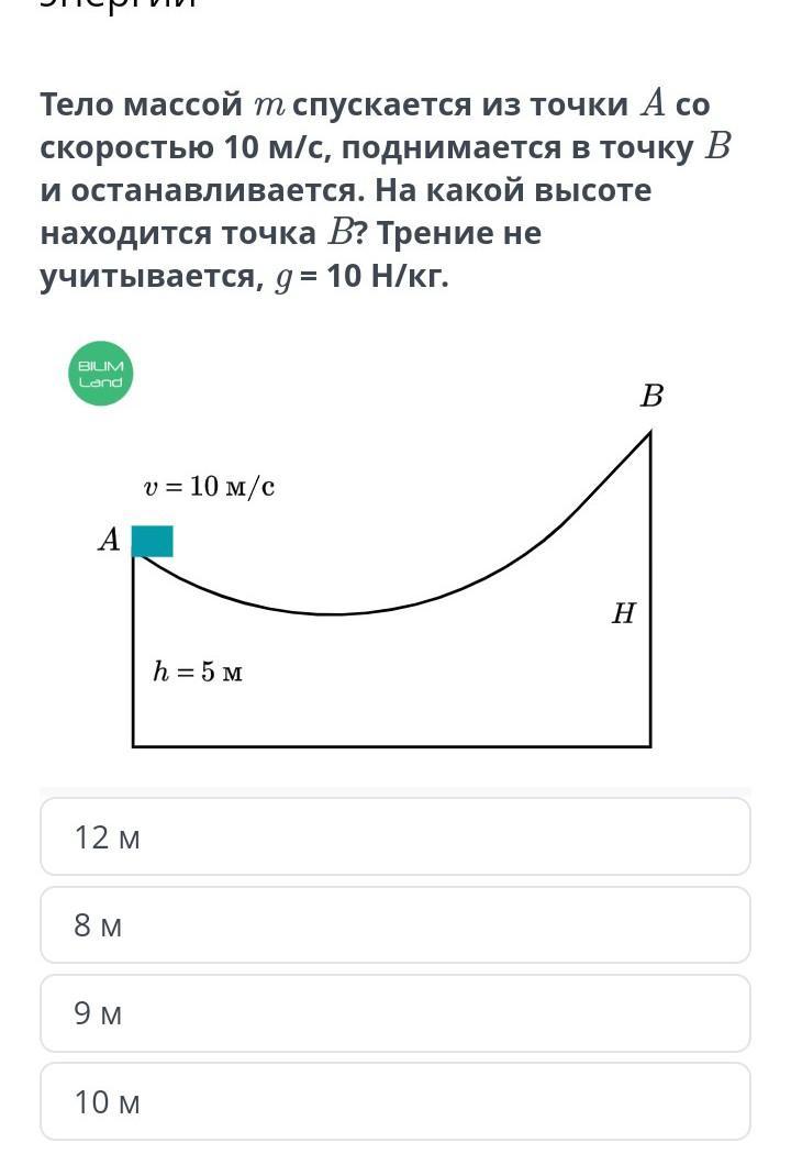 Тело массой т спускается из точки А со скоростью 10 м/с, поднимается в точку В и останавливается. На какой высоте находится точка В? Трение не учитывается, 9 = 10 Н/кг. BILIM Land B В v = 10 м/с А A.