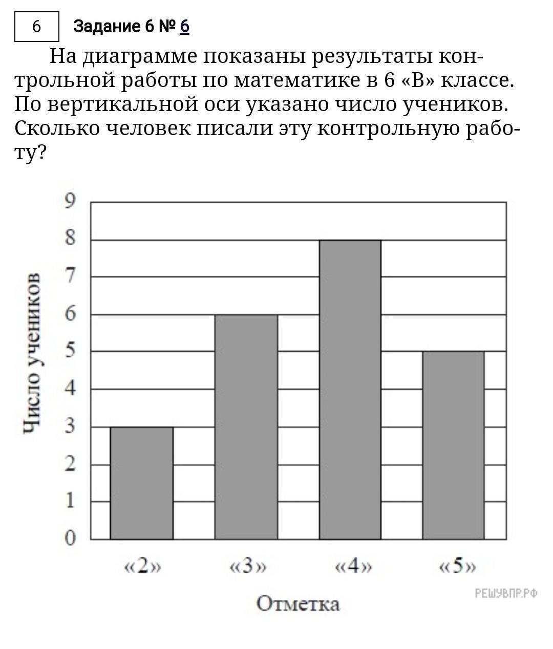 На диаграмме показаны результаты контрольной работы по математике в 6 «В» классе. По вертикальной оси указано число учеников. Сколько человек писали эту контрольную работу?