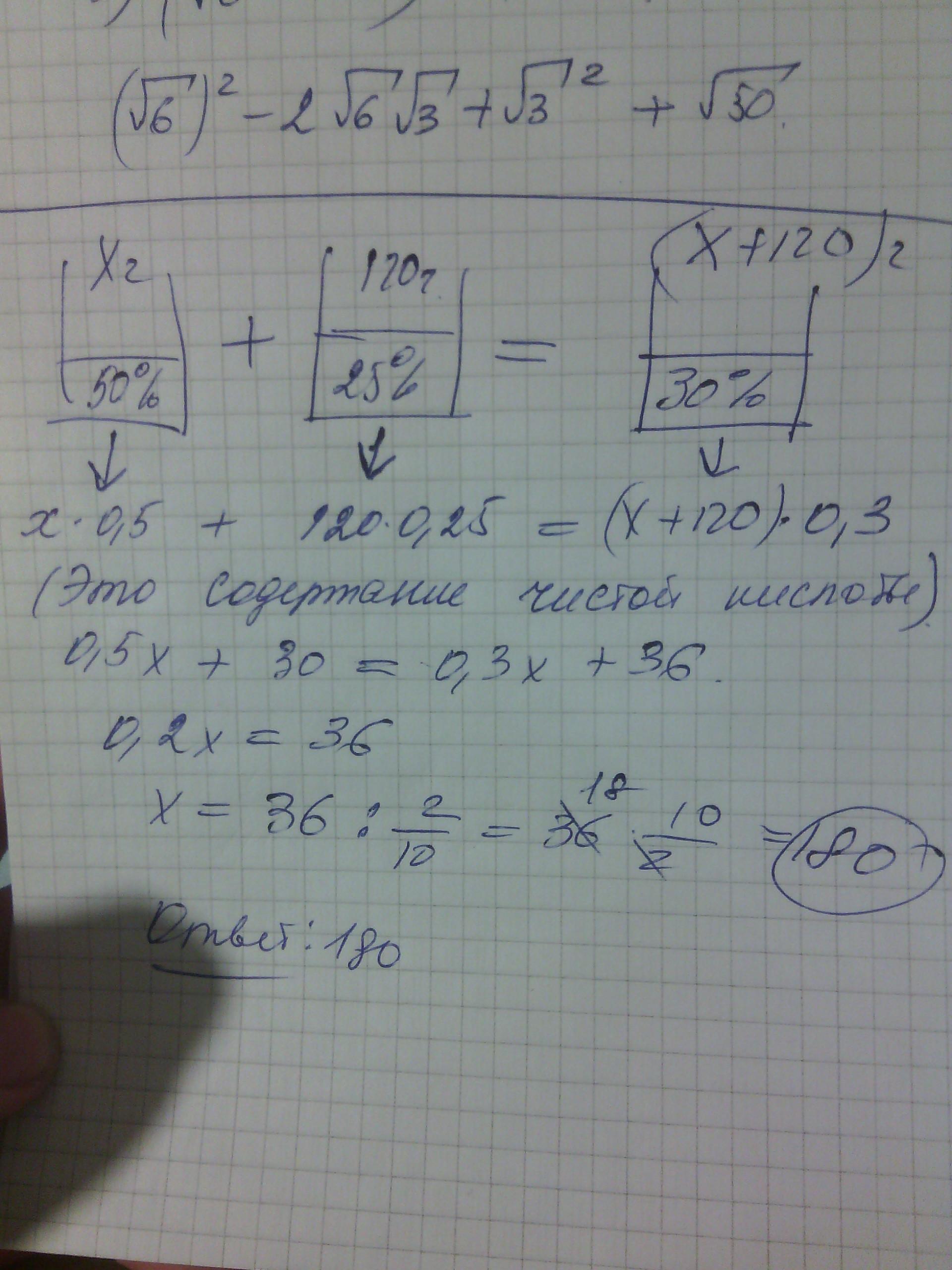 Сколько 50%-го раствора кислоты нужно Добавить к 120 граммам 25%-го раствора Той же кислоты, чтобы получить 30%-й раствор?