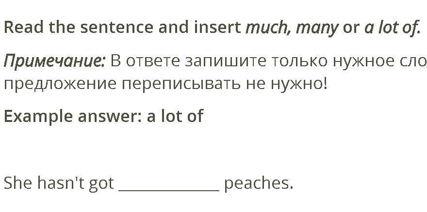 2 Если в предложении есть отрицательная частица not или другое слово с отрицательным значением, то нужно использовать many или much, а не a lot of. Поскольку peaches - исчисляемое сущ. во множ. числе, нужно выбрать many