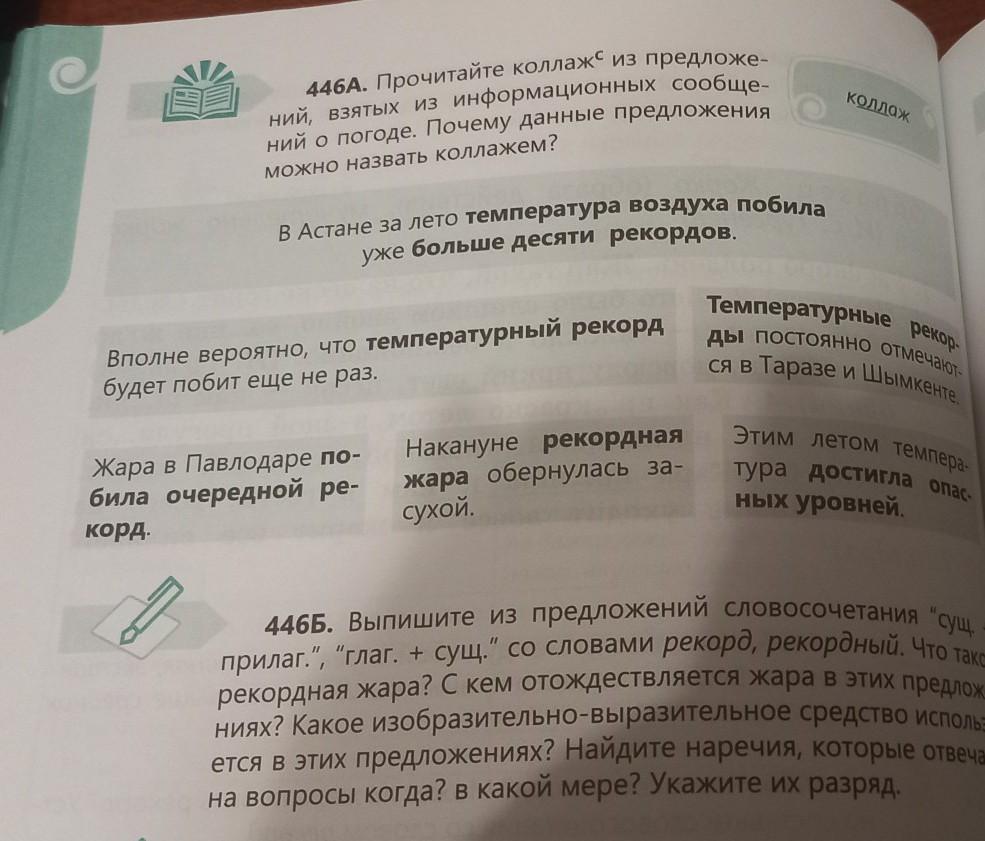 446Б. Выпишите Из предложений словосочетания сущ+прилаг."? Какое изобразительно-выразительное средство использу- рекордная жара? С кем отождествляется жара в этих предложе прилаг.", "глаг. + сущ." со словами рекорд, рекордный. Что такое ется в этих предложениях? Найдите наречия, которые отвечанол на вопросы когда? В какой мере? Укажите их разряд.