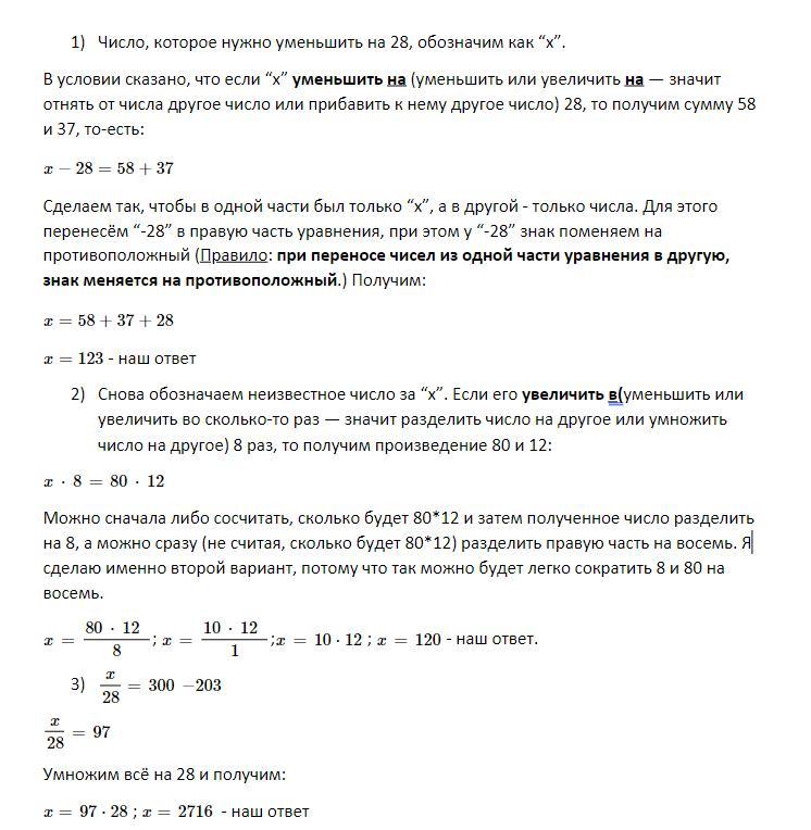 25. Составь по задачам уравнения и реши их: 1) Какое число надо уменьшить на 28, чтобы по- лучилось число, равное сумме чисел 58 и 37? 2) Какое число надо увеличить надо увеличить в 8 раз, чтобы получилось число, равное произведению чисел 80 и 12? 3) Какое число надо уменьшить в 28 раз, чтобы получилось число, равное разности чисел 300 и 203?