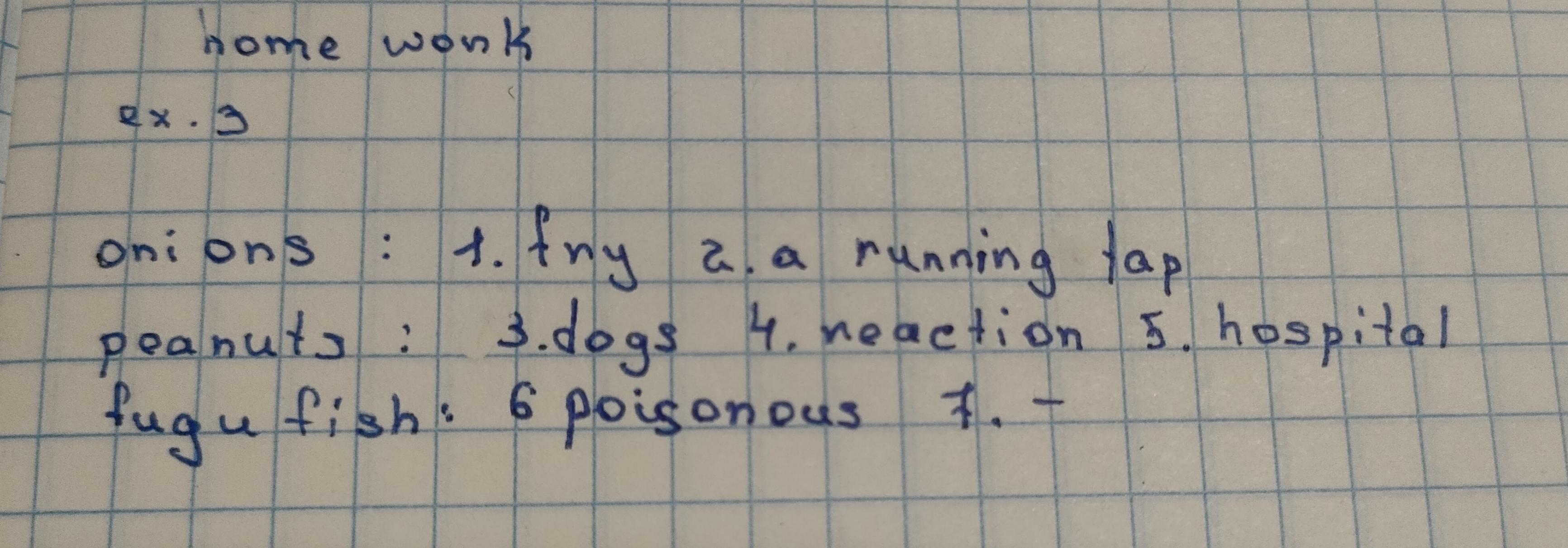 3 Read the webpage again. Copy and complete the table. Food onions Possible dangers Advice They can make you Chop them under .. 2 when you chop them They are poisonous Get to a(n) as soon for?.. and they can as you can. cause a bad ... in some humans. peanuts fugu fish They are extremely 6 6 Only eat fugu fish that has been prepared by a(n) garlic It can give you a serious 8 Don't let it get in contact with your
