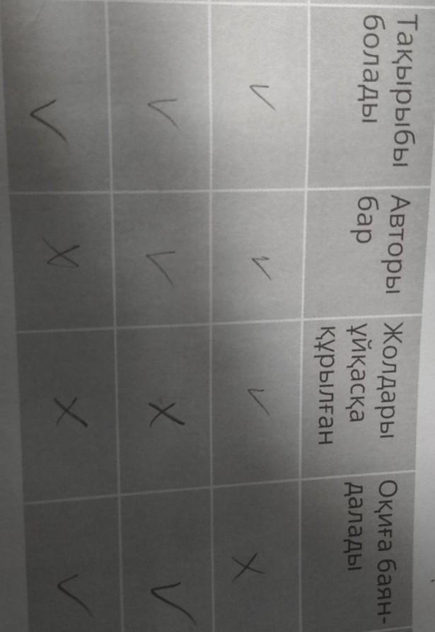 6. Кестедегі мәліметті талқыла. Тақырыбы Авторы Жолдары болады бар ұйқасқа құрылған Оқиға баян. Кейіпкері далады болады өлең әңгіме ертегі