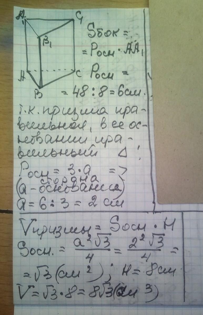 Объем V=Sосн*h=√3 * 8 = 8√3 см³