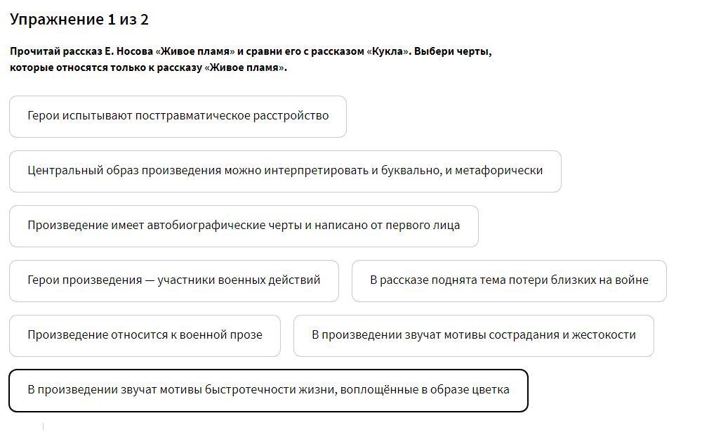 Прочитай рассказ Е. Носова «Живое пламя» и сравни его с рассказом «Кукла». Выбери черты, которые относятся только к рассказу «Живое пламя».
