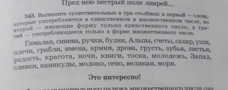 343. Выпишите существительные и три столбика и первый-слов атороя - имеюшие форму только единственного числа, в тре - употребляющиеся только в форме множественного числа.