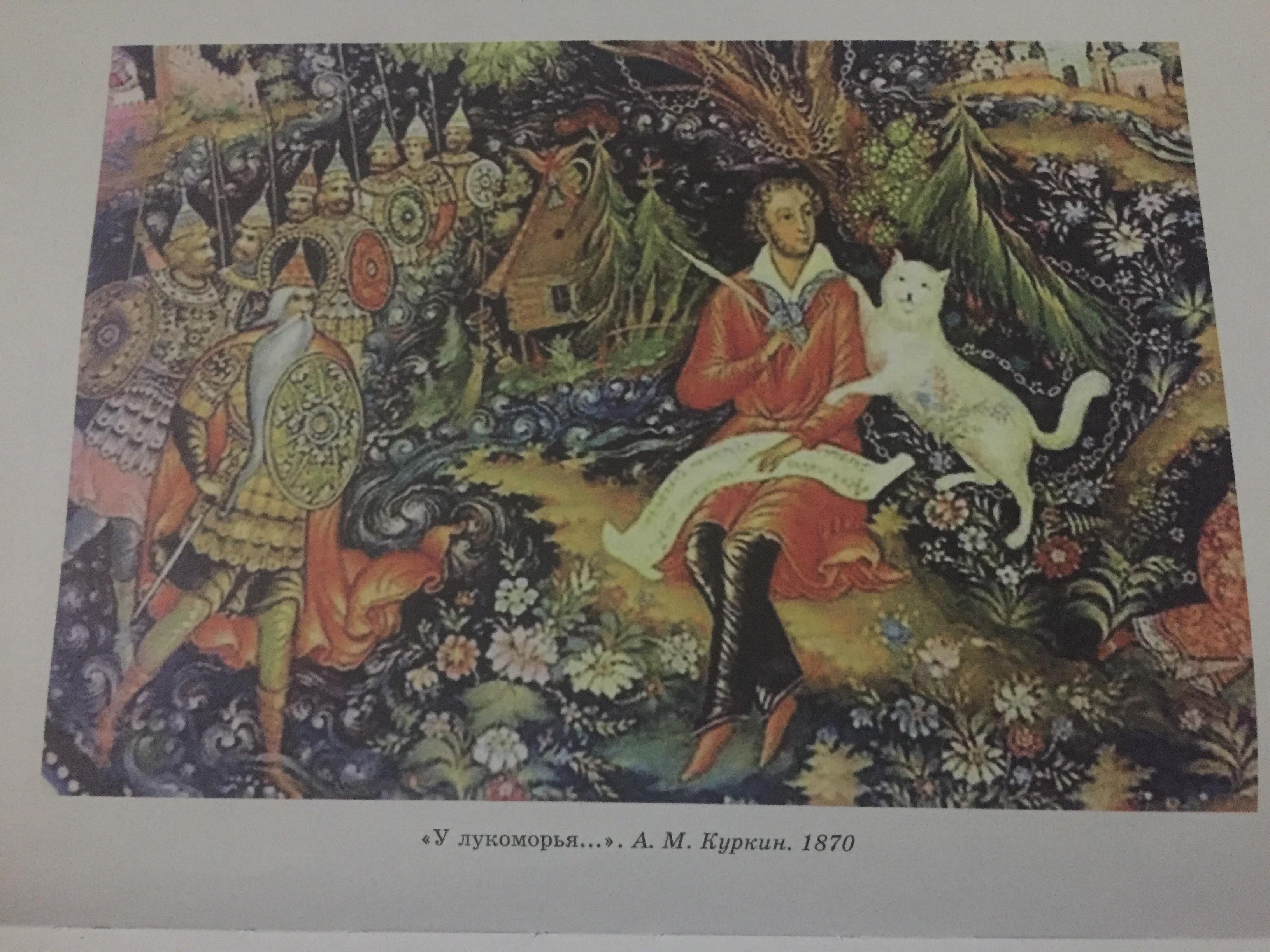 На этой картине сидит мужчина, рядом с ним кот. Где то в стороне идет царевич и его войско. На заднем плане дом,волшебный сад. Справа в верхнем углу замок.
