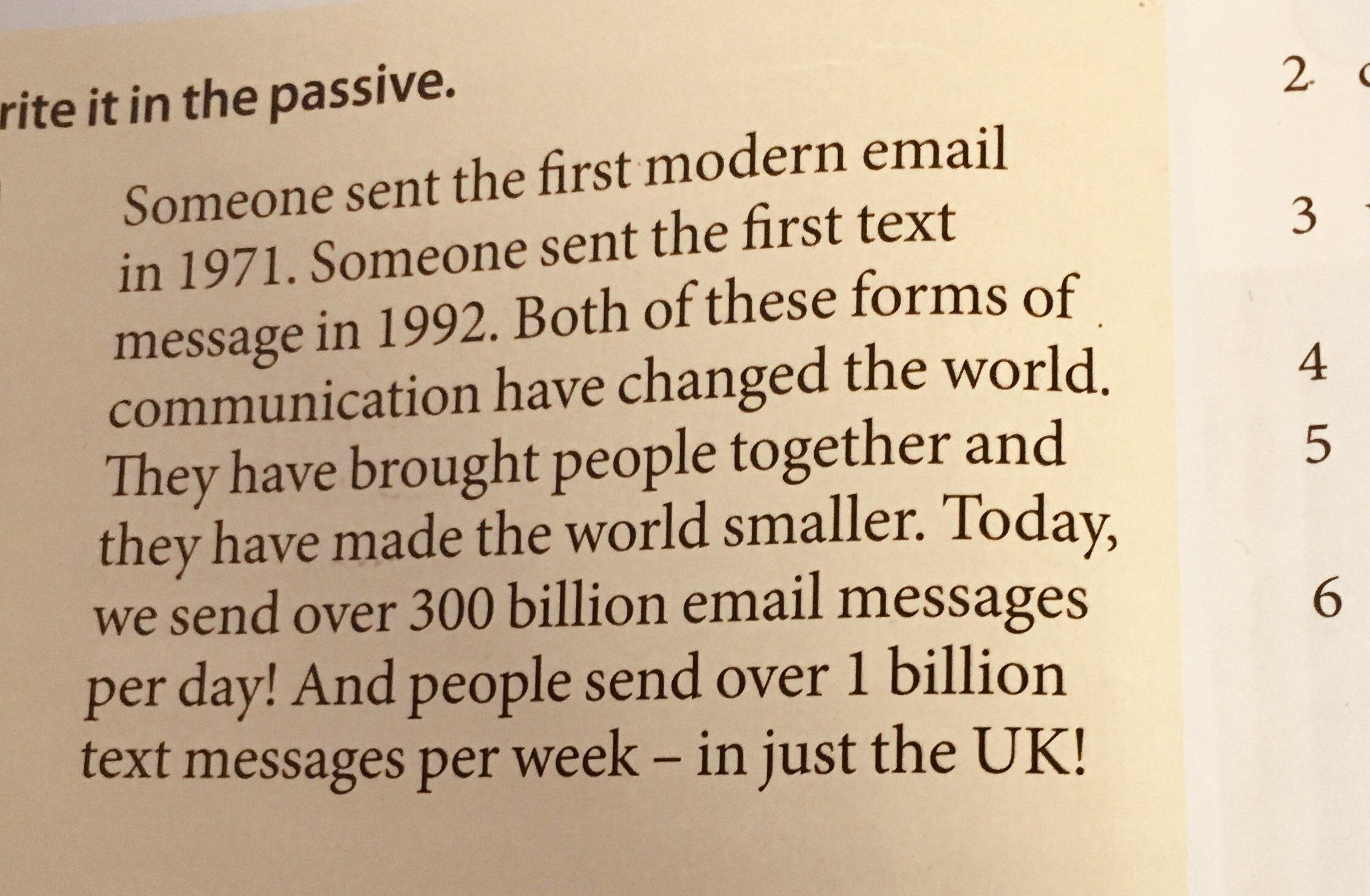 1. The first modern email was sent by someone in 1971. The first text message was sent by someone in 1992. The world has been changed by both of these forms of communication. People have been brought together by them and the world has been made smaller by them. Over 300 billion email messages per day are sent by us today. And over 1 billion text messages per week are sent by people - in just the UK!! .