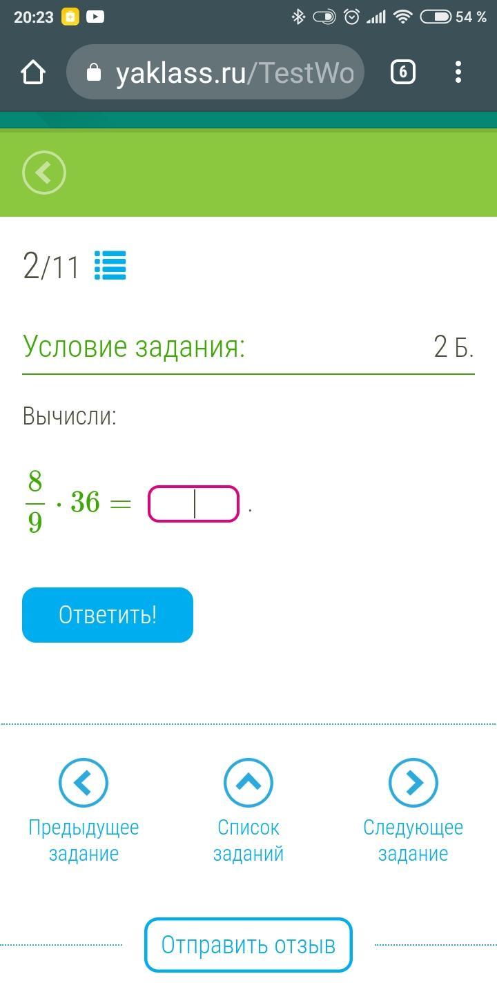 36 отходит в числитель, и нам нужно записать всё под одну черту. У нас получается в числителе 8*36, а в знаменателе 9. Дальше нам нужно сократить 36 и 9 на 9 (сократить значит два числа из числителя и знаменателя разделить на дно и то же число, вместо этого числа записать частное) после сокращения у на остаётся 8*4 в числителе и 1 в знаменателе. Теперь нам нужно найти произведение 8*4=32
