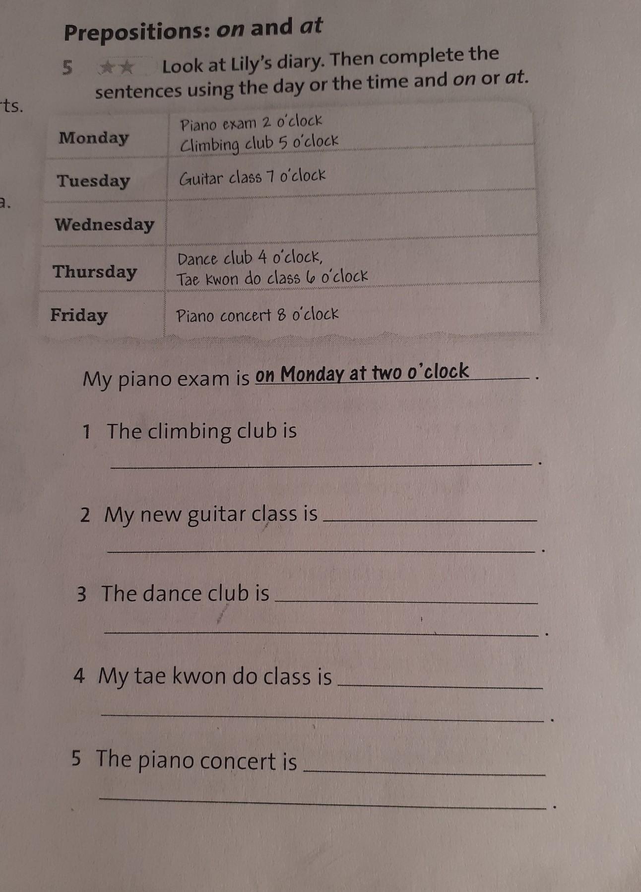 Prepositions: on and at 5 Look at Lily's diary. Then complete the sentences using the day or the time and on or at Pano axen 2 o'clock Monday Climbing club 5 o'clock Tuesday Guter class 7 o'clock Jia. Wednesday Thursday Dance club 4 o'clock, Ta kon do class 6 o'clock Friday Peno conceri 8 o'clock My piano exam is on Monday at two o'clock 1 The climbing club is 2 My new guitar class is t. 3 The dance club is 4 My tae kwon do class is 5 The piano concert is