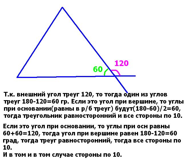 Боковая сторона равнобедренного треугольника равна 10 см. Один из внешних углов треугольника равен 120. Найдите длину основания треугольника