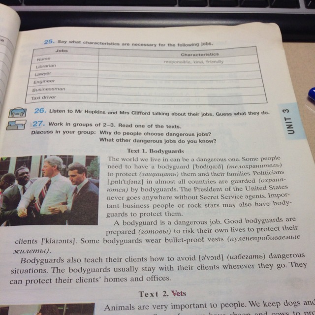 Мир, в котором мы живем, может быть опасным. Некоторые люди нуждаются в телохранителях для себя и своих семей. У политиков практически всех стран есть телохранители. Президент Соединенных Штатов не ходит никуда без агентов секретной Спецслужбы. У влиятельных бизнесменов или звезд также могут быть свои телохранители. Работа телохранителя очень опасная. Профессиональные телохранители подготовлены к тому, чтобы рисковать своей жизнью ради спасения своих клиентов. Некоторые телохранители надевают пуленепробиваемые бронежилеты. Телохранители также учат своих клиентов, как избежать опасных ситуаций. Телохранители обычно сопровождают своих клиентов, куда бы они не пошли. Они могут охранять дома и офисы своих клиентов.