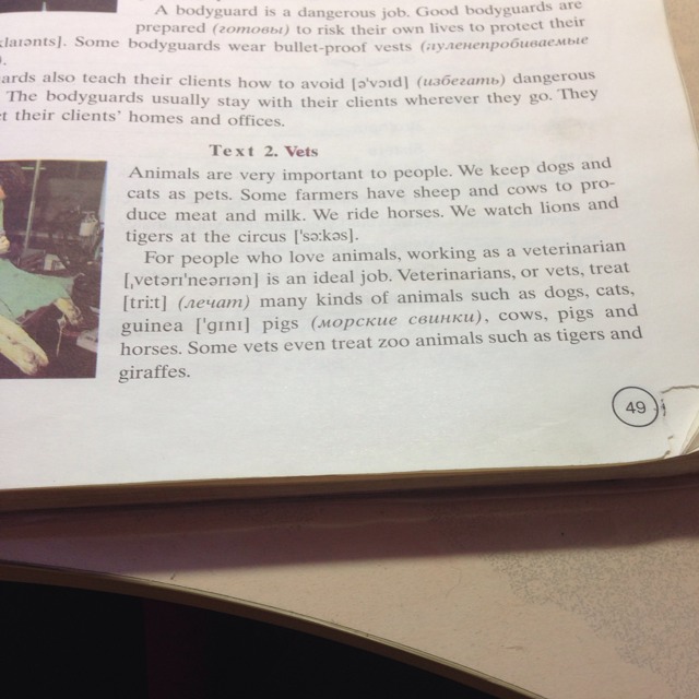Для людей кто любит животных работа в качестве ветеринара - идеальная работа. Ветеринарные врачи или ветеринары лечат много видов животных таких как собаки, кошки, морские свинки, коровы, свиньи и лошади. Некоторые ветеринары даже лечат животных в зоопарке таких как тигры и жирафы.