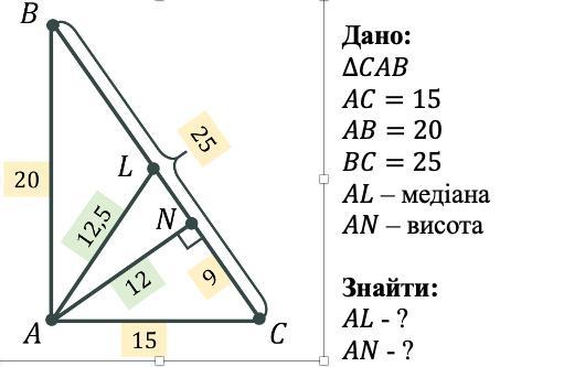 Сторони трикутника дорівнюють 15 см, 20 см і 25 см. Знайдіть медіану і висоту, проведені до найбільшої сторони.