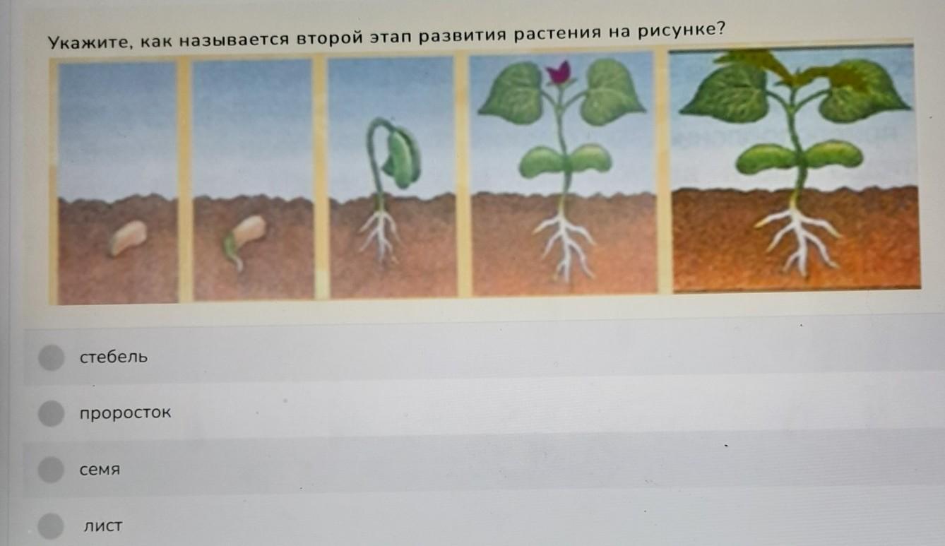 Укажите, как называется второй этап развития растения на рисунке?