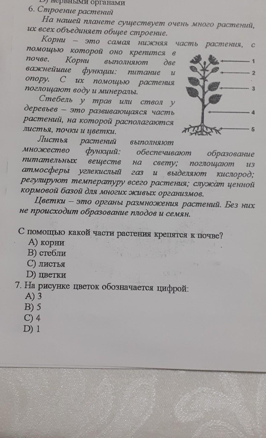 С помощью какой части растения крепятся к почве? А) корни В) стебли C) листья D) цветки