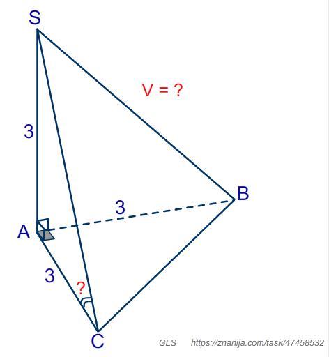 В треугольной пирамиде SABC основание - треугольник ABC, ∠А=90°. Ребро SA перпендикулярно плоскости основания. SA = AB = AC = 3. Найти объем пирамиды и угол наклона ребра SC к плоскости основания.