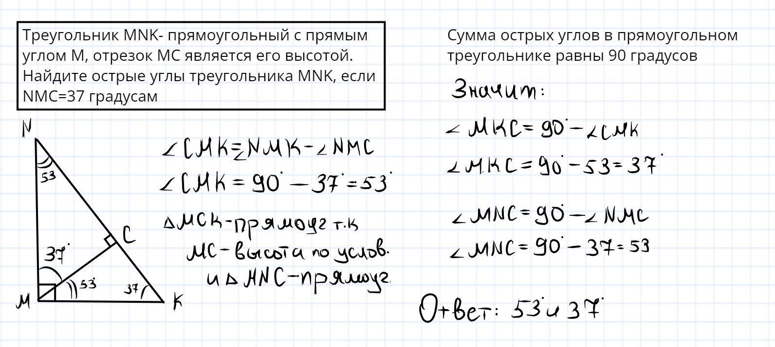 Треугольник MNK- прямоугольный с прямым углом M, отрезок MC является его высотой. Найдите острые углы треугольника MNK, если NMC=37 градусам