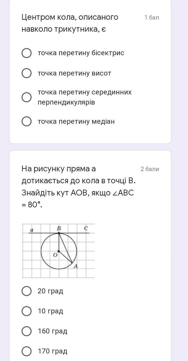 AOB-правильний трикутник, дві сторони-радіуси, значить кути при підставі рівні, знаходимо кут AOB: 180-2*10=160