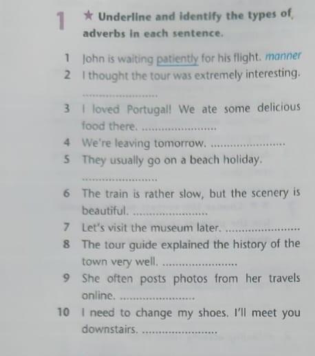 1 Johin is waiting patiently for his flight. manner 2 I thought the tour was extremely interesting. 3 loved Portugall We ate some delicious food there. 4 We're leaving tomorrow. 5 They usually go on a beach holiday. 6 The train is rather slow, but the scenery is beautiful. 7 Let's visit the museum later.. . 8 The tour guide explained the history of the town very well. 9 She often posts photos from her travels online. 10 I need to change my shoes. I'll meet you downstairs