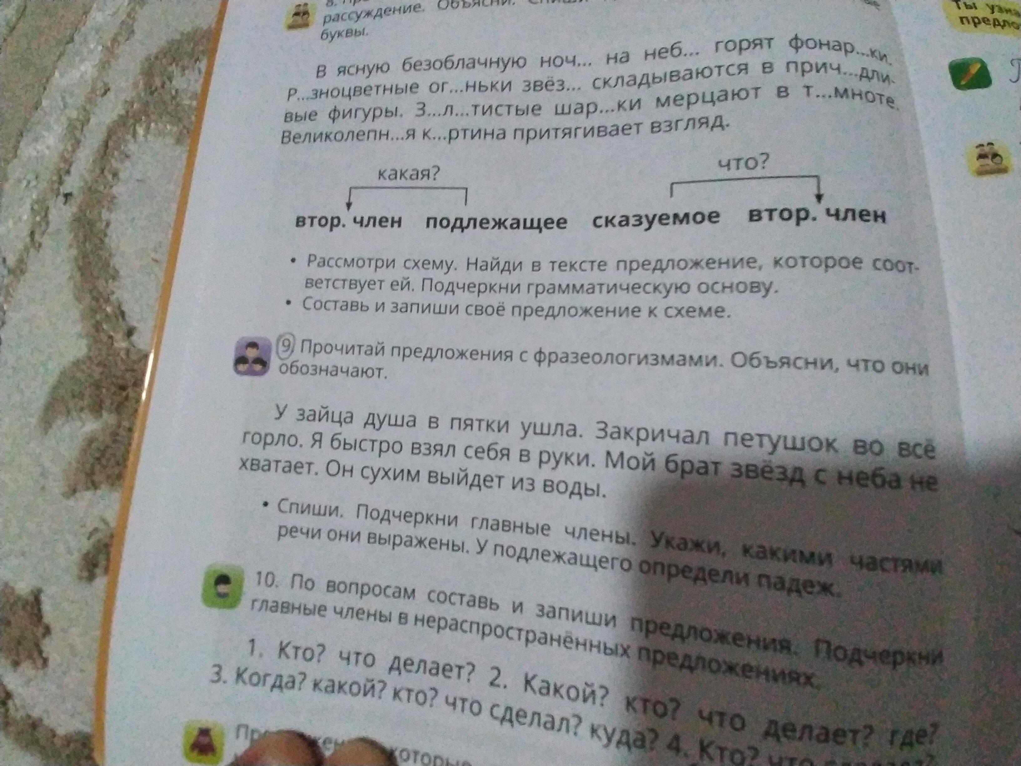 Прочитай предложения с фразеологизмами. Обьясни, что он обозначают. Спиши, Подчеркни главные члены. Укажи, каким частями речи они выражены. У подлежащего определи падеж