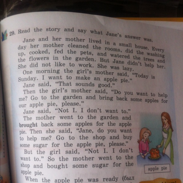 Тогда мама сходила в сад и принесла обратно несколько яблок для яблочного пирога. Затем она сказала: "Джейн, ты хочешь помочь мне? Сходи в магазин и купи немного сахара для яблочного пирога, пожалуйста".