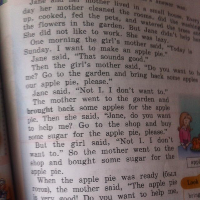 джейн и её мама жили в маленьком доме. каждый день её мама чистила комнаты, мыла посуду, готовила, кормила животных, и поливала деревья и цветы в саду. но джейн не помогала ей. она не любила работать. она была ленивая. одним утром Девочкина мама сказала "сегодня воскресенье. я хочу сделать яблочный пирог."джеин сказала " это звучит хорошо" потом Девочкина мама сказала "ты хочешь мне помочь? пойди в сад и принеси немного яблок для нашего яблочного пирога" джеин сказала" нет не я. я не хочу." мама пошла в сад и принесла немного яблок. потом она сказала "джейн та хочешь мне помочь? пойди в магазин и купи не много сахара для яблочного пирога, пожалуйста." но девочка ответила "нет не я. я не хочу." тогда мама пошла в магазин и купила не много сахара для яблочного пирога.