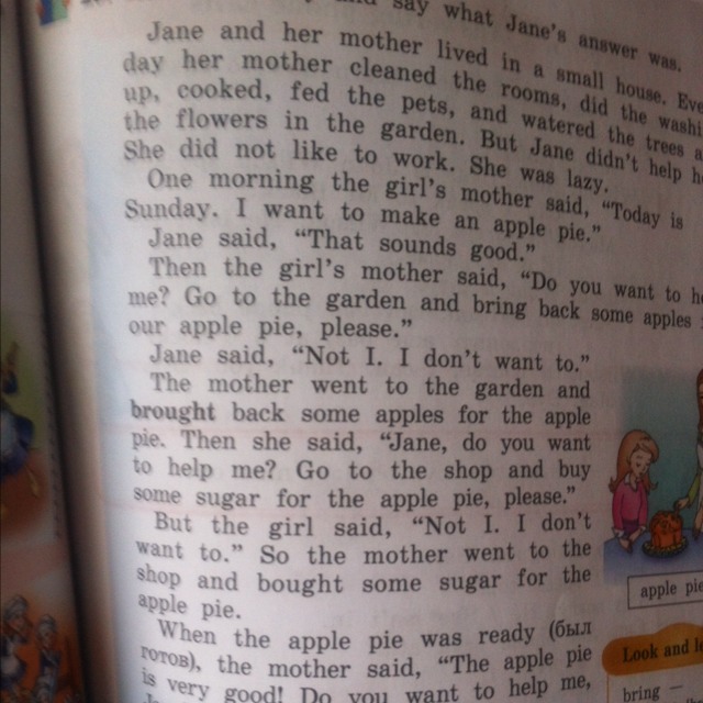 когда яблочный пирог был готов мама сказала "яблочный пирог очень хороший! джейн ты хочешь мне помочь?" джейн сказала " да конечно (yes ofcours)!"