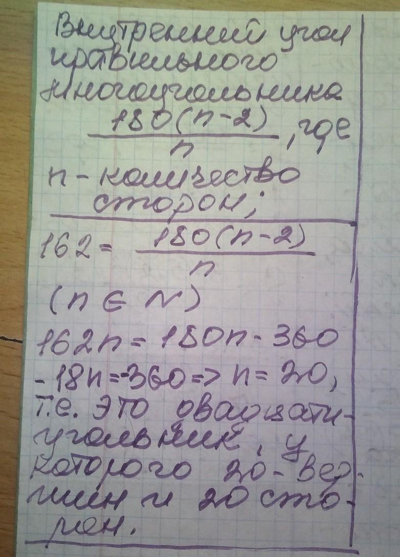 знайдіть кількість вершин правильного многокутника внутрішній кут якого дорівнює 162°​