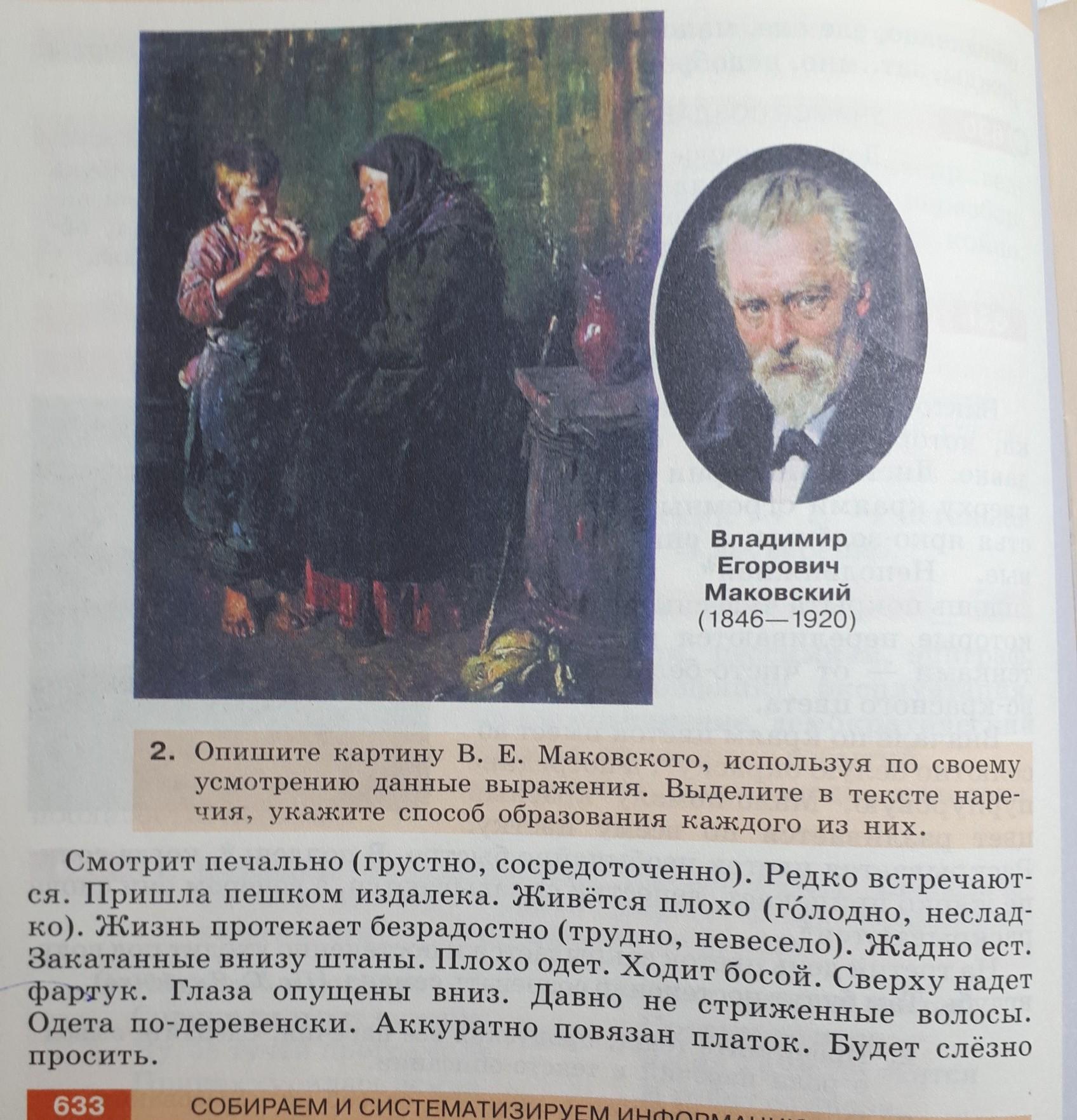 опишите картину Маковского используя по своему усмотрению данные выражения выделите в тексте наречия укажите способ образования каждого из них какие произведения русской литературы проходит на память когда вы рассматриваете эту какие чувства вызывает эта картина?
