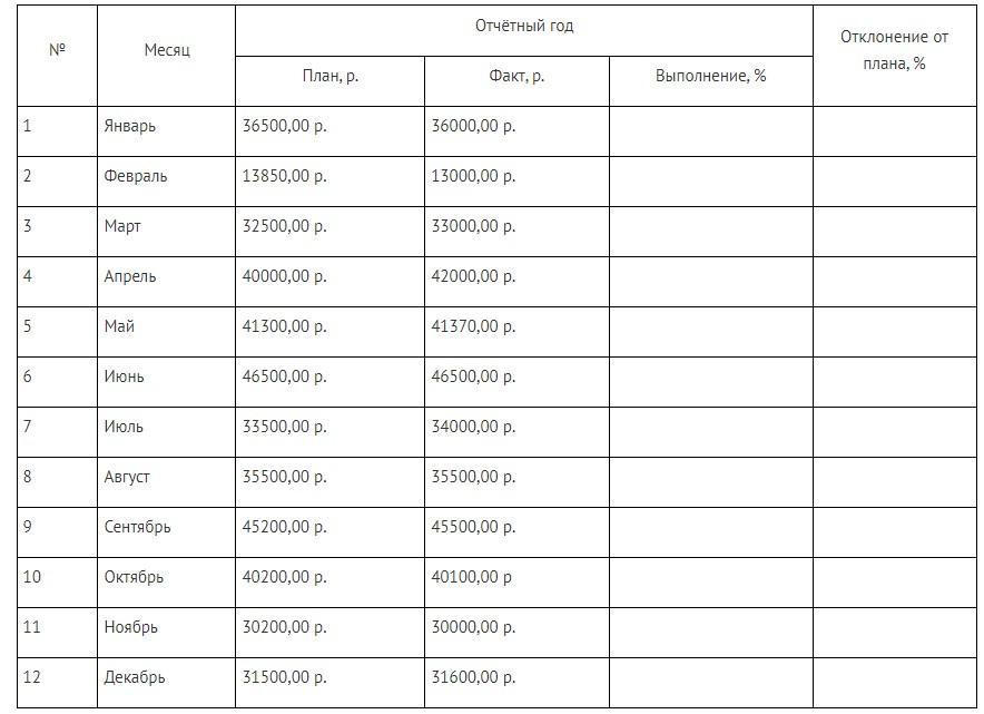 Выполните вычисления для столбцов «Выполнение», «Отклонение от плана». Отклонение от плана работы – это разница, заданная в процентном формате, между фактическим выполнением и планом