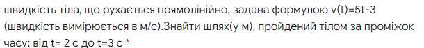 по известной скорости, интегрируя ее по времени, можно найти путь. он равен определенному интегралу от 2 до 3 от функции v(t)=5t-3, это 5t²/2-3t, используя формулу Ньютона-Лейбница, получим