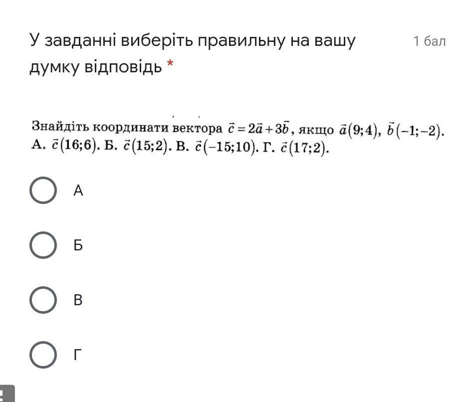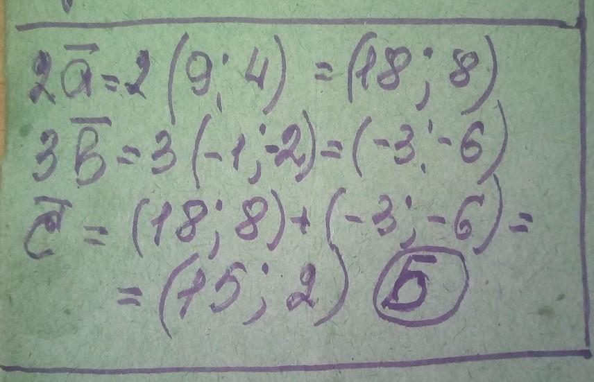 Знайдіть координати вектора с = 2+ 3Ь, якщо ä(9;4), 5(-1;-2). А. (16;6). Б. с (15;2). B. c(-15;10). г. с (17;2).