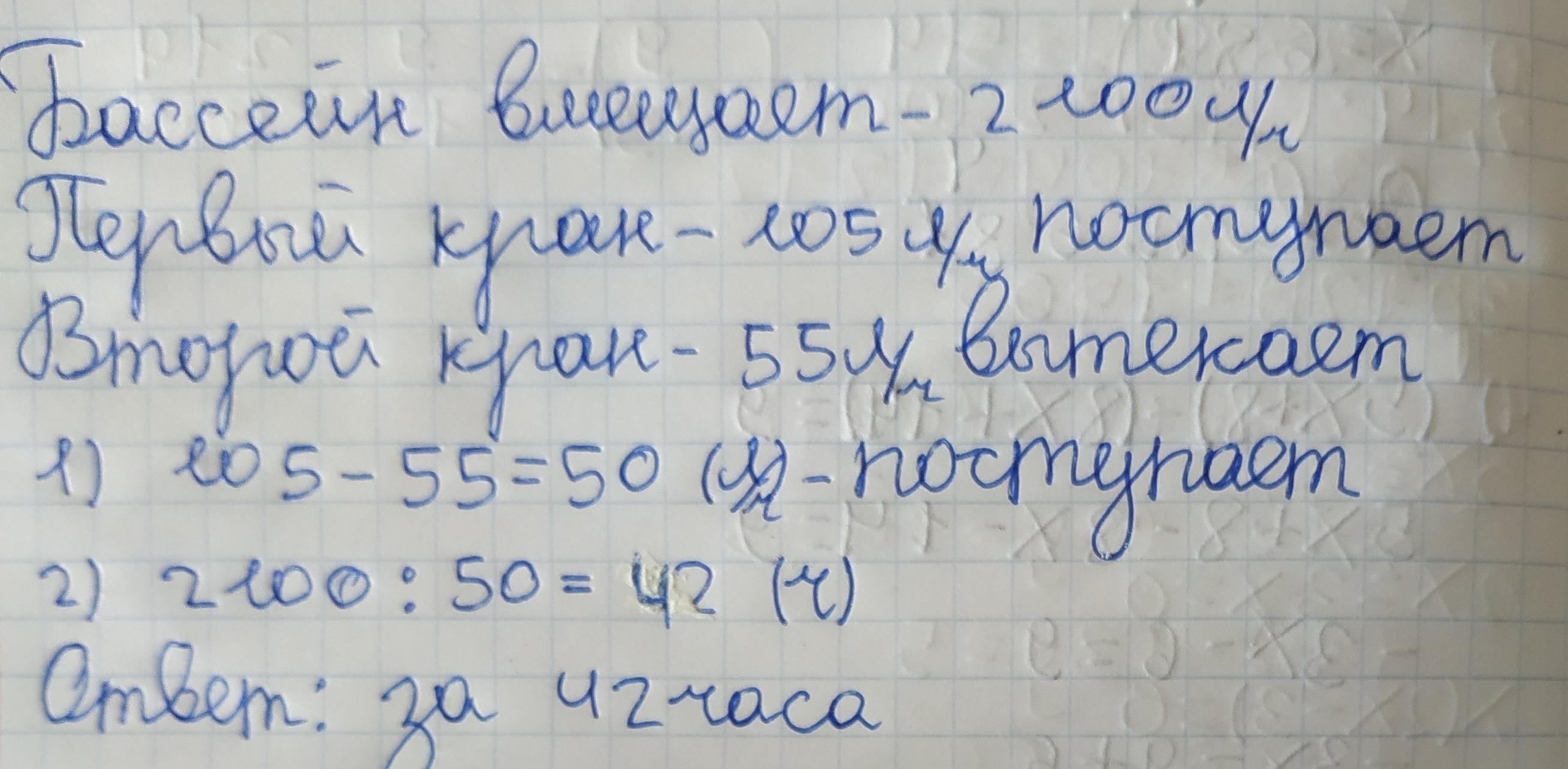 К бассейну, который вмешает 2100 л воды, подклю- чены два крана. За час через первый кран в бассейн поступает 105 л воды. А второй кран соединен к сере- дине бассейна и за час через него вытекает 55 л воды. За какое время наполнится бассейн, если оба крана включить одновременно?