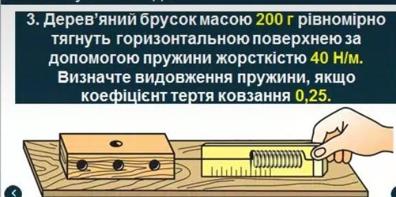 Дерев'яний брусок масою 200 г рівномірно Тягнуть горизонтальною поверхнею за допомогою пружини жорсткістю 40 Н/м. Визначте видовження пружини, якщо коефіцієнт тертя ковзання 0,25.