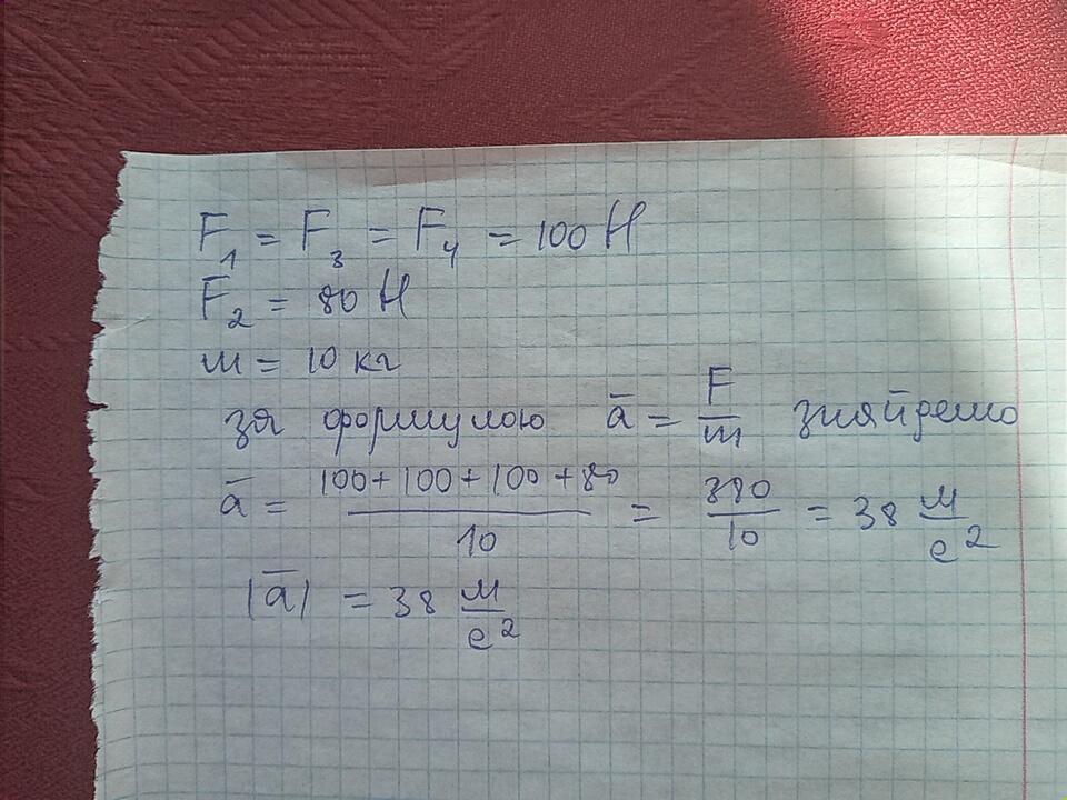 Знайти модуль прискорення тіла масою 10 кг під дією чотирьох прикладених до нього сил: F¹ = F³ = F⁴ = 100 H, F², = 80 Н. .