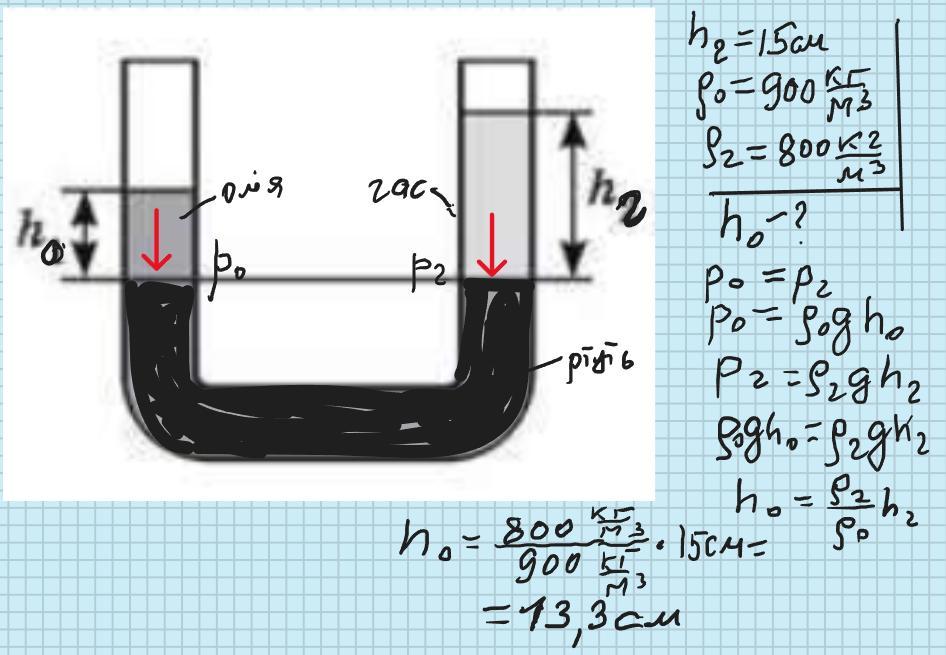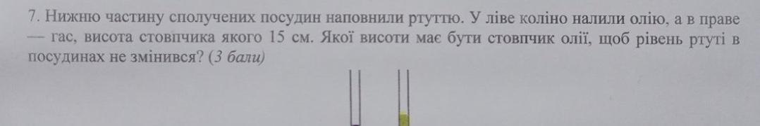 7. Нижню частину сполучених посудин наповнили ртуттю. У ліве колiно налили олію, а в праве гас, висота стовпчика якого 15 см. Якої висоти має бути стовпчик олії, щоб рiвень ртуті в посудинах не змінився? (3 бали)