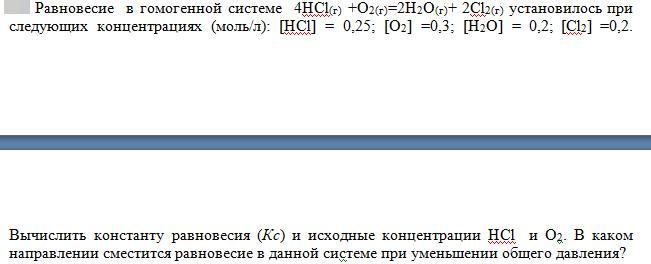 Ответ: Kc = 1,37 , [HCl]исх. = 0,65 моль/л [O₂]исх. = 0,4 моль/л Равновесие при уменьшении общего давления оно будет смещаться ВЛЕВО.