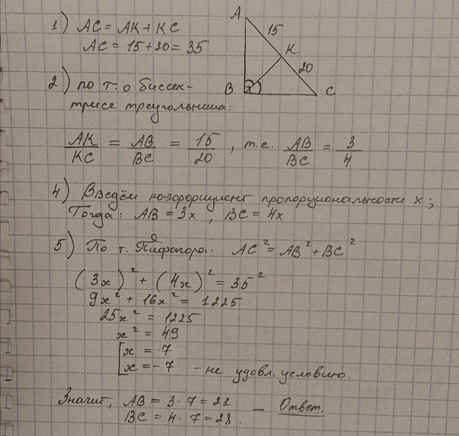 Бісектриса прямокутного трикутника ділить гіпотенузу на відрізки завдовжки 15 см і 20 см. Знайдіть катети трикутника.