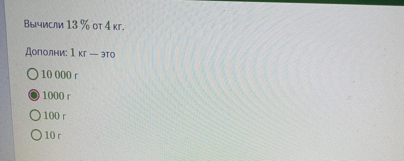 Вычисли 13 % от 4 кг. Дополни: 1 КГ — это O 10 000 O 10000 О 100 г О10 г 13 % от 4 кг Ответить