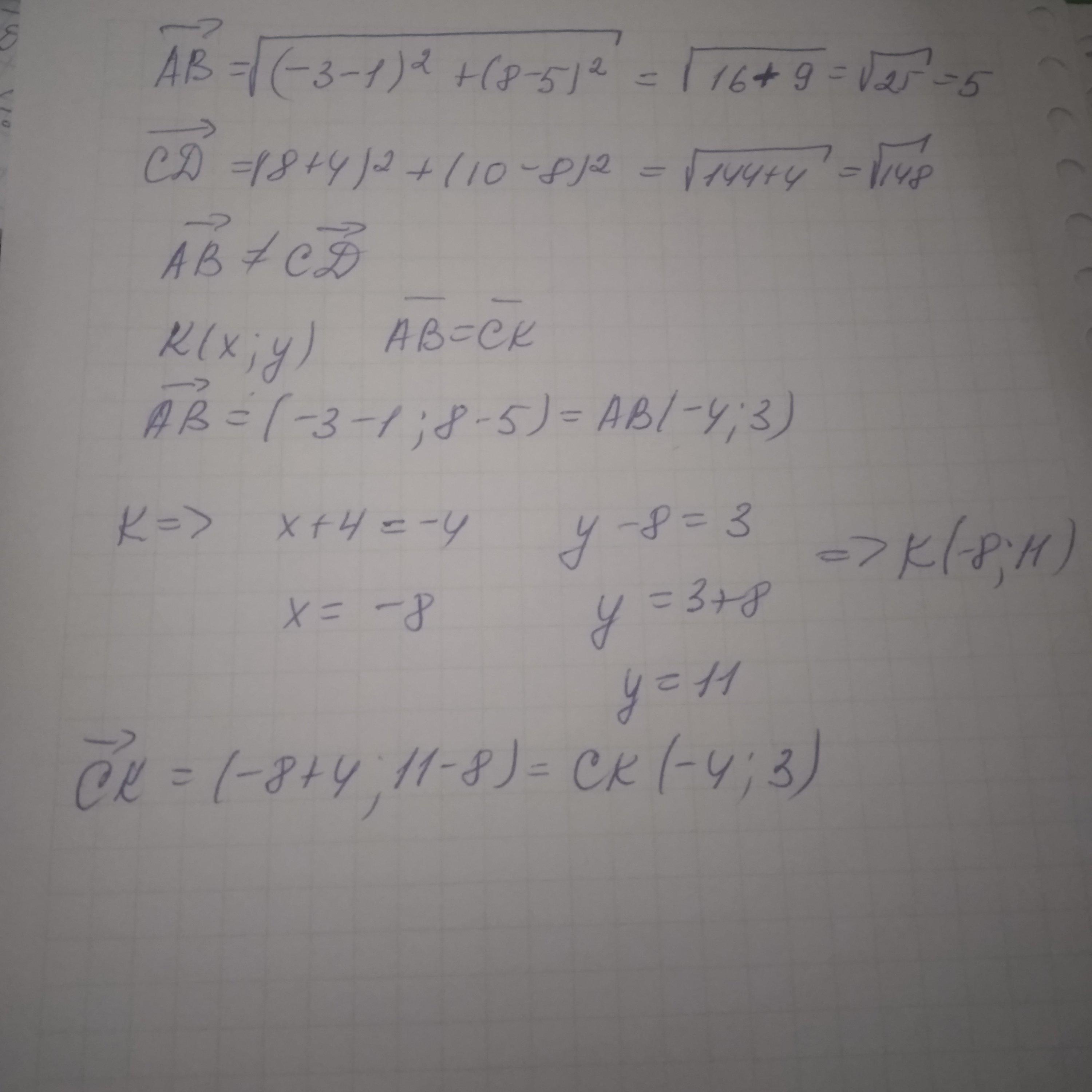 Дано точки А(1;5), В(-3;8), С(-4;8), Д(8;10), К(х;у). Чи рівні вектори АВ і СД? Знайдіть х і у, якщо АВ=СК