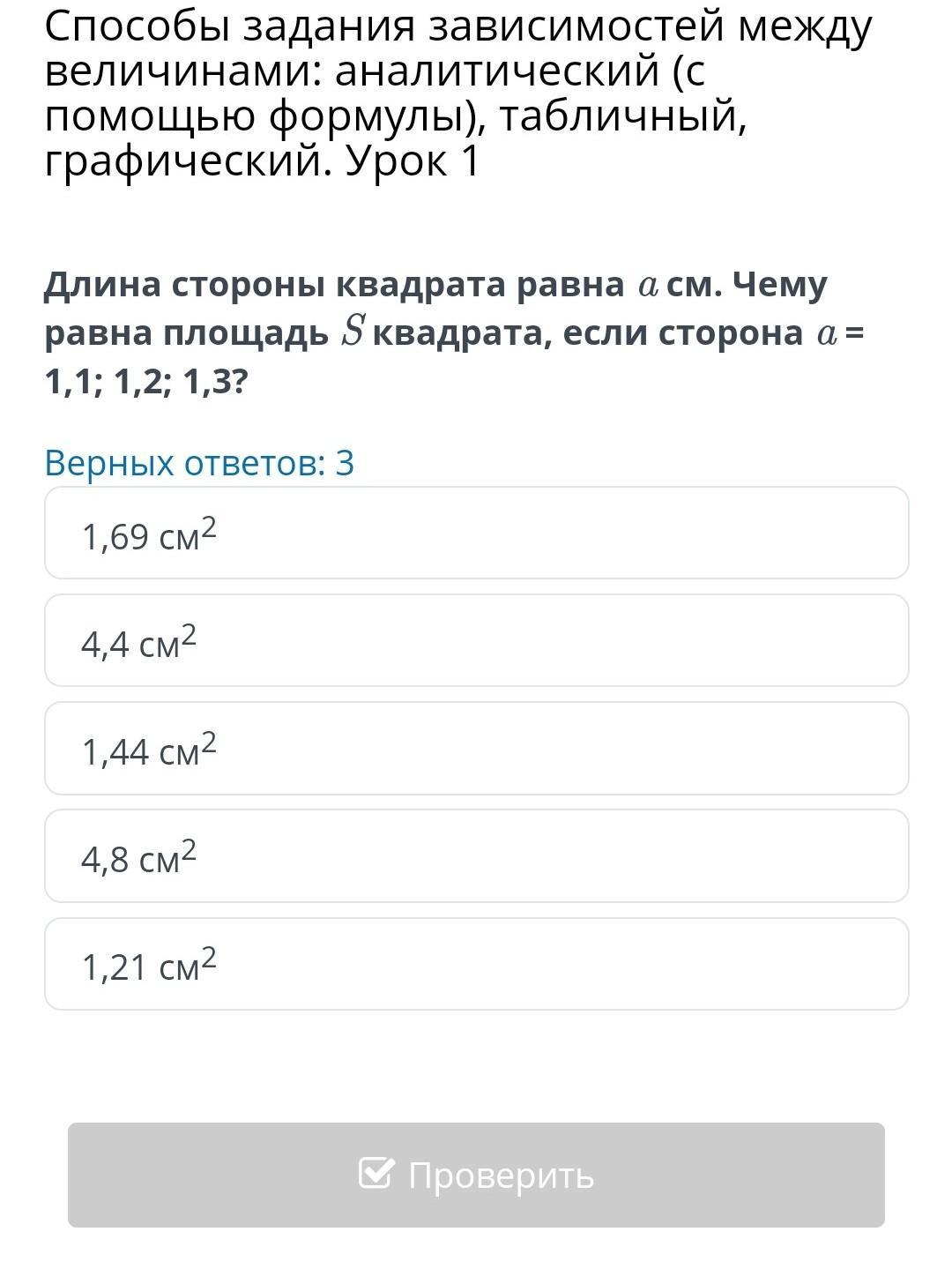 длина стороны квадрата равна а см.Чему равна площадь S квадрата, если сторона а=1,1;1,2;1,3, СРОЧНО ДАМ 30Б
