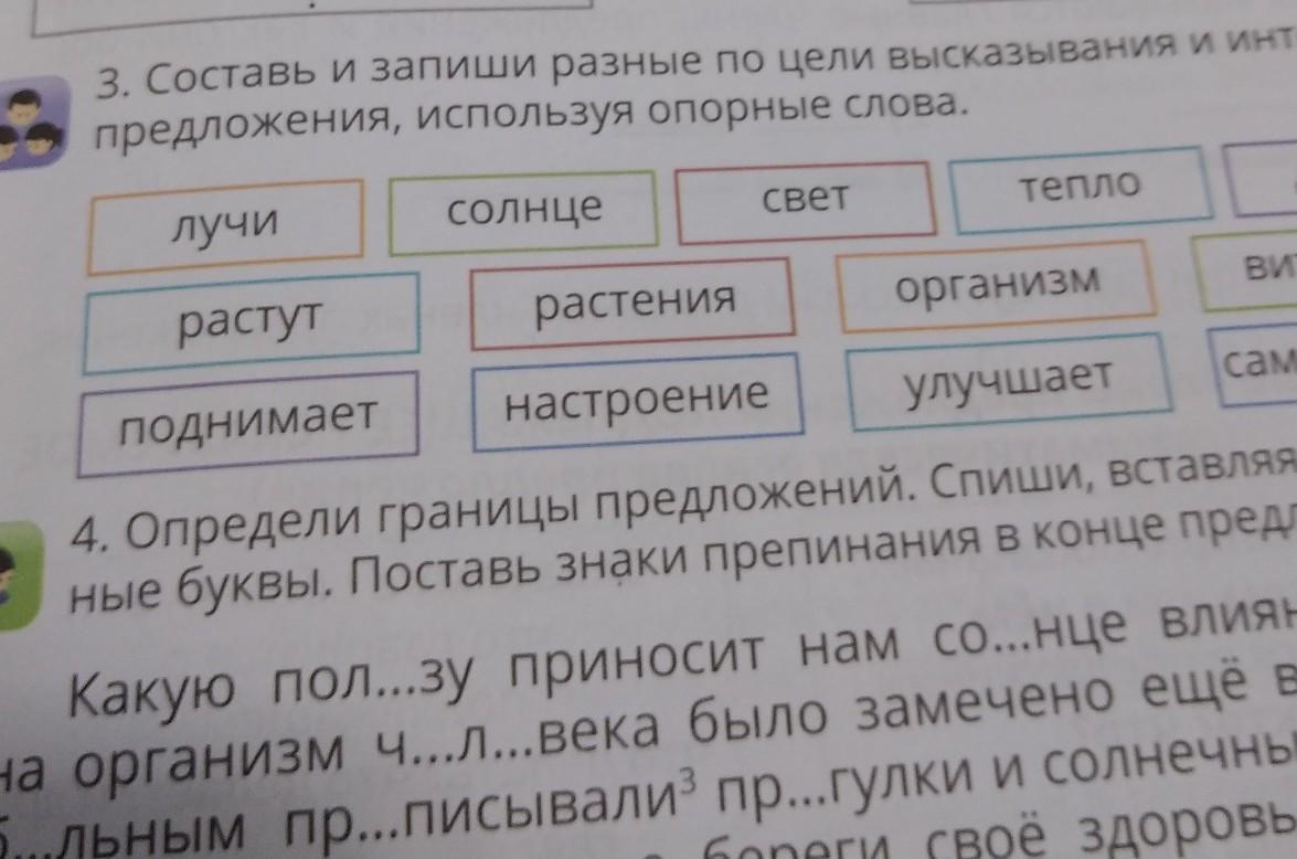 восклицательные 3. Составь и запиши разные по цели высказы предложения, используя опорные слова лучи солнце Свет Ten растут растения организм поднимает настроение улучшае 4. Определи границы предложений. Спиши, ные буквы. Поставь знаки препинания в кон