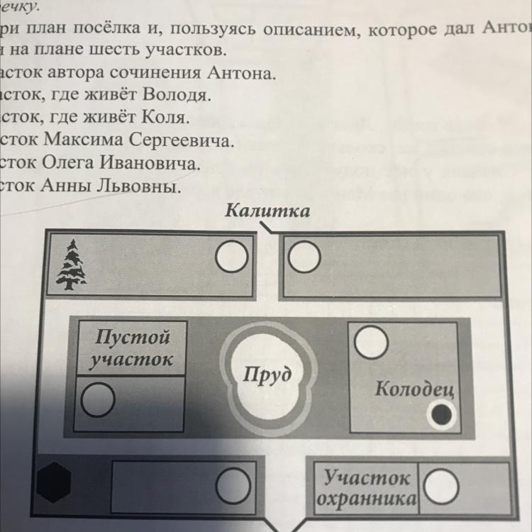 Рассмотри план посёлка и, пользуясь описанием, которое дал Антон, обозначь