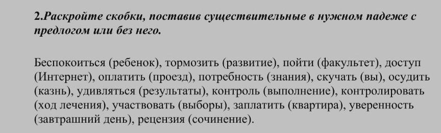 Беспокоиться о ребенке, тормозить развитие, пойти на факультет, доступ в Интернет, оплатить проезд, потребность в знаниях, скучать по вас, осудить казнь, удивляться результатам, контроль за выполнением, контролировать ход лечения, участвовать в выборах, заплатить за квартиру, уверенность в завтрашнем дне, рецензия на сочинение.
